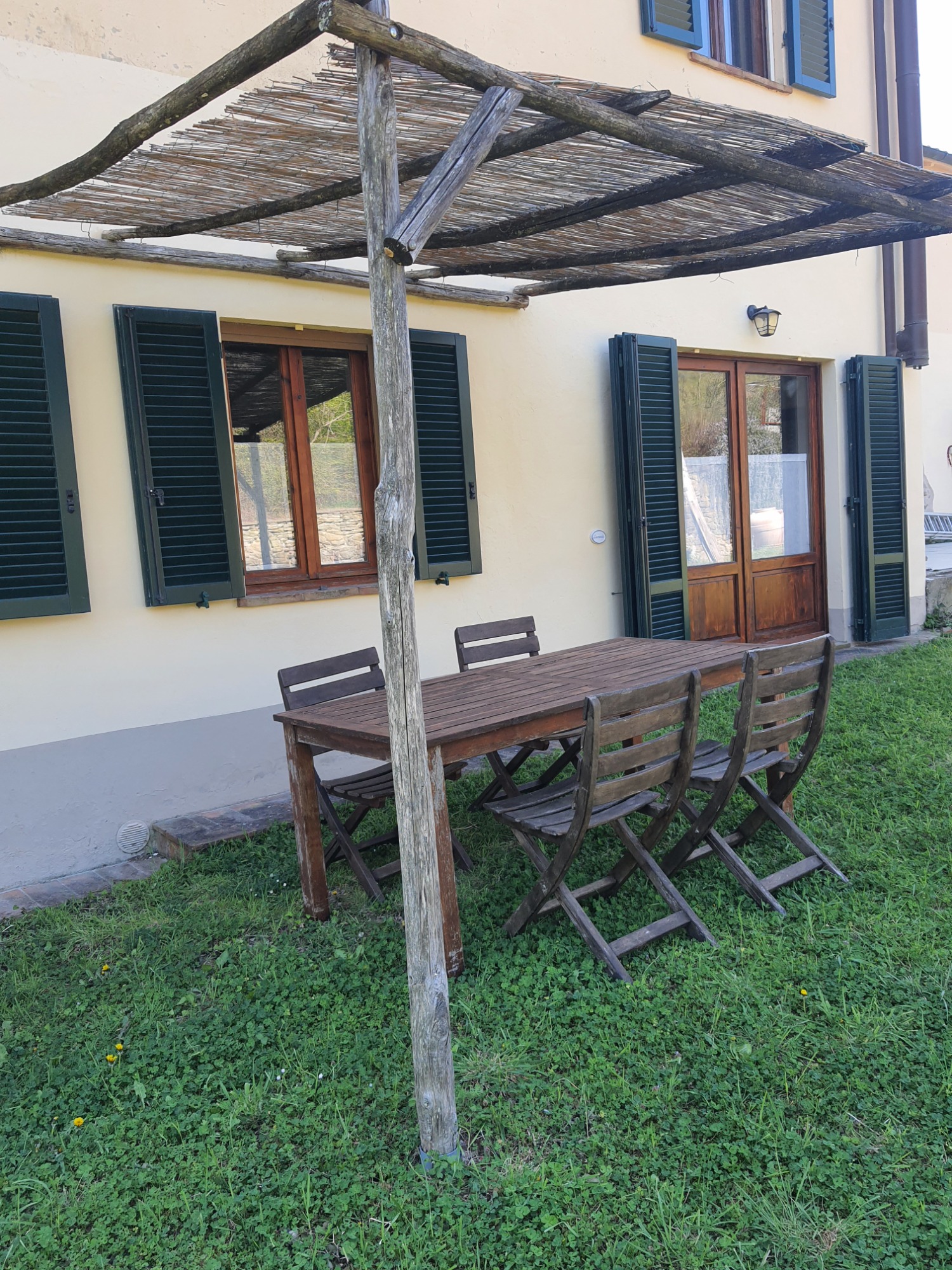 Vor der Wohnung befindet sich eine private Terrasse mit Esstisch und Sonnendach aus Naturmaterialien. Von hier blickt man direkt in den Garten – perfekt für Mahlzeiten im Freien oder zum Entspannen im Grünen.