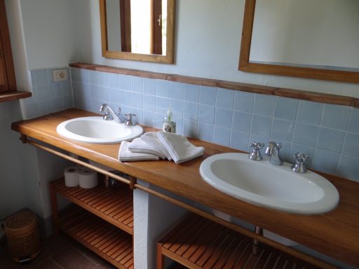 Ein Badezimmer mit Doppelwaschbecken und Dusche, hell und großzügig gestaltet.